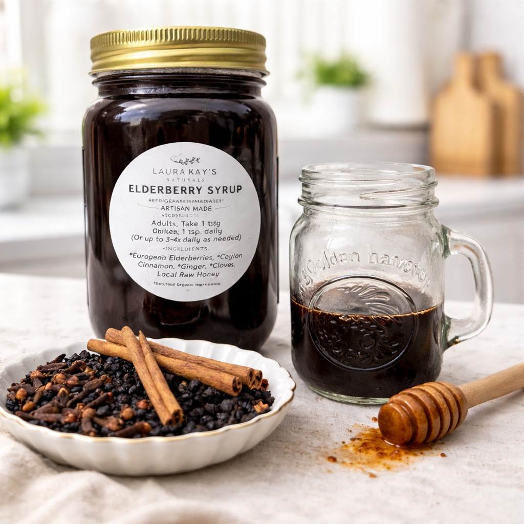 From small-batch elderberry syrup to raw honey, herbal tea blends, and all-natural soaps — everything we make is rooted in simple ingredients and the goodness God provides. Thoughtfully crafted for whole-body wellness, inside and out.